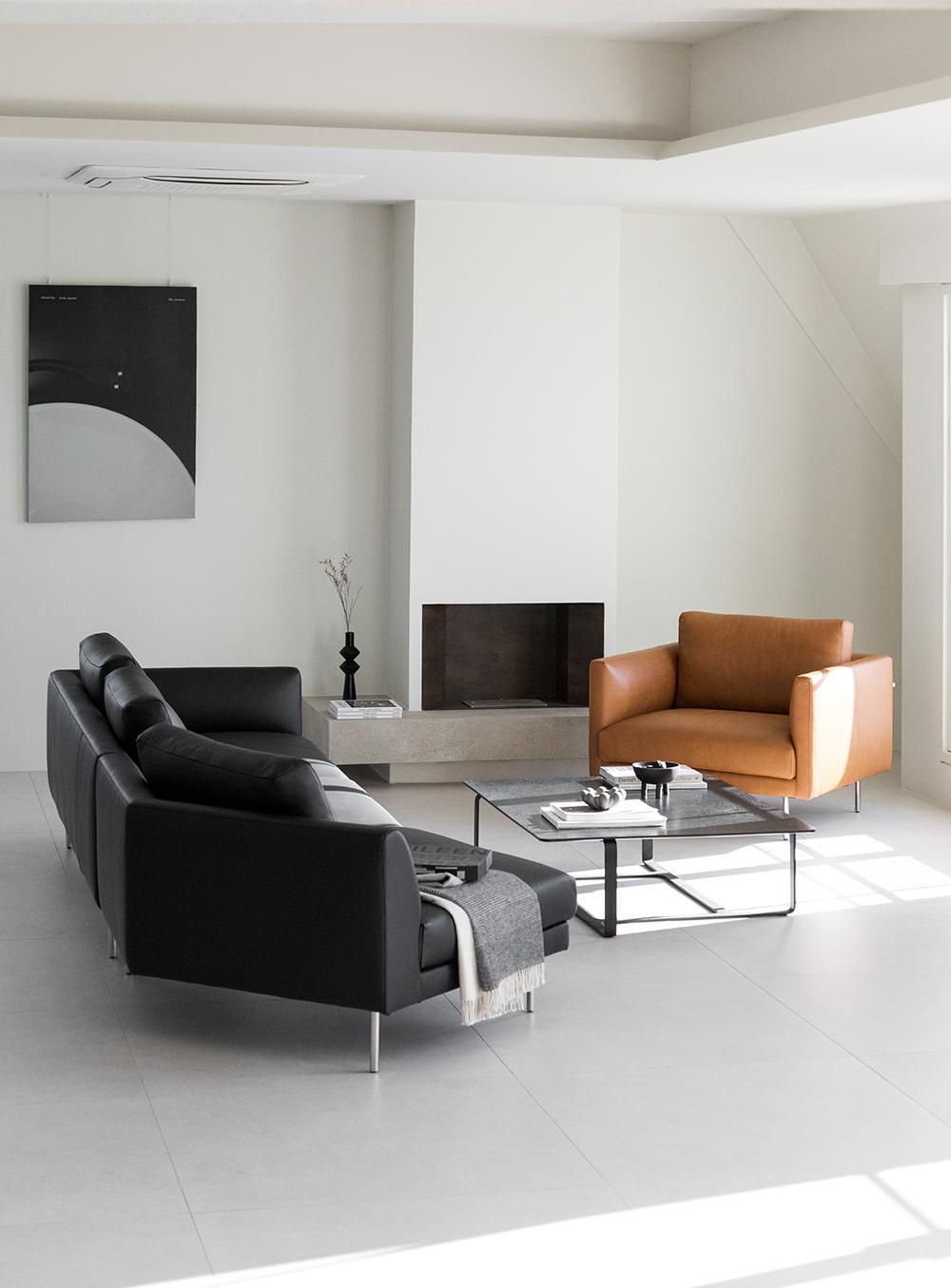 直線的で端正なシルエットが、リビングをノイズのない整然とした空間へと導きます。その一方で、ユニークな五角形のカウチモジュールがアクセントとなり、従来のソファにはない自由で感度の高いリビングシーンを演出。